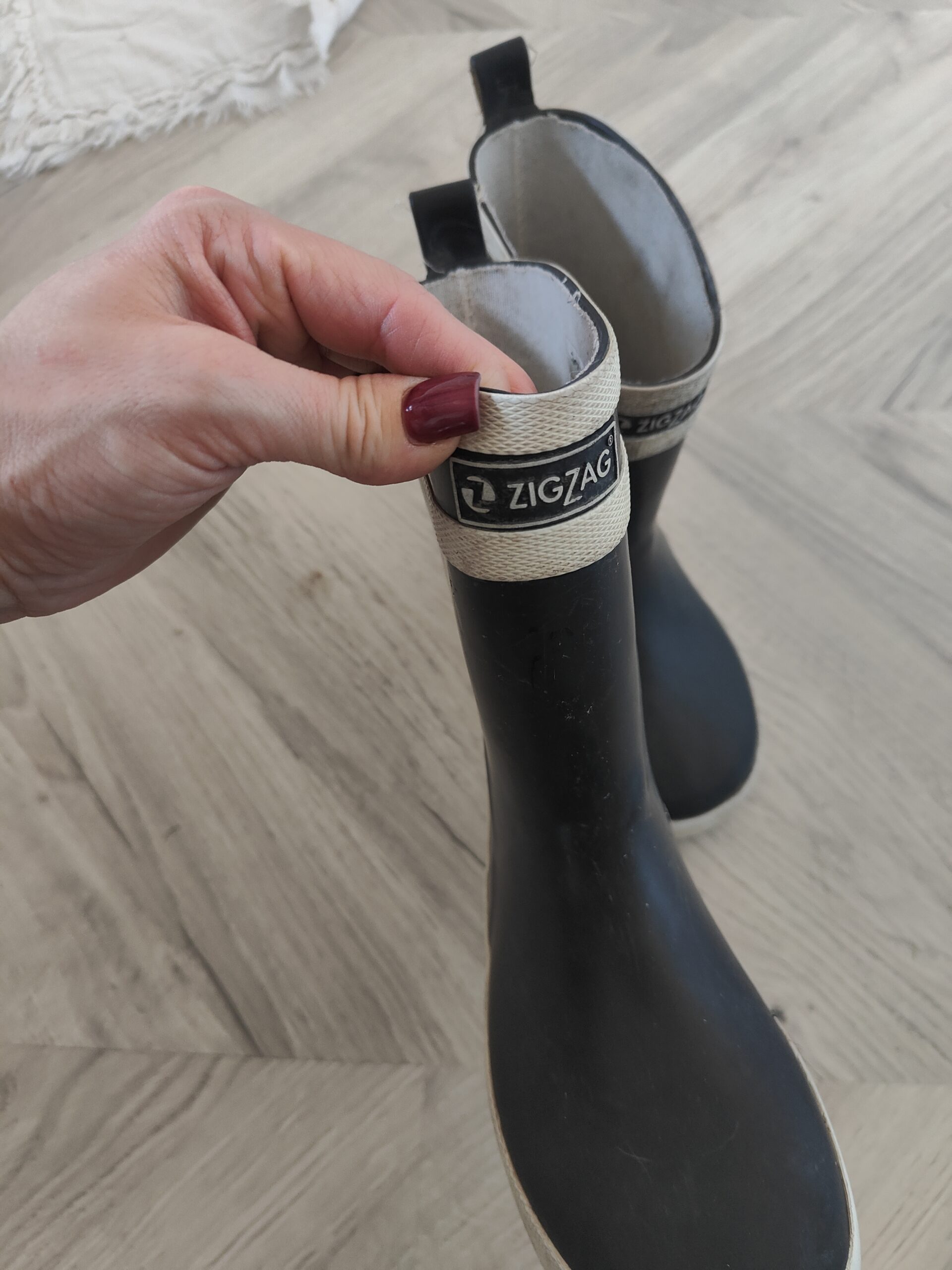 Zigzag kumisaappaat. Siistit , valkoisissa osissa hieman tummentumaa. Koko 30 . Mustat.