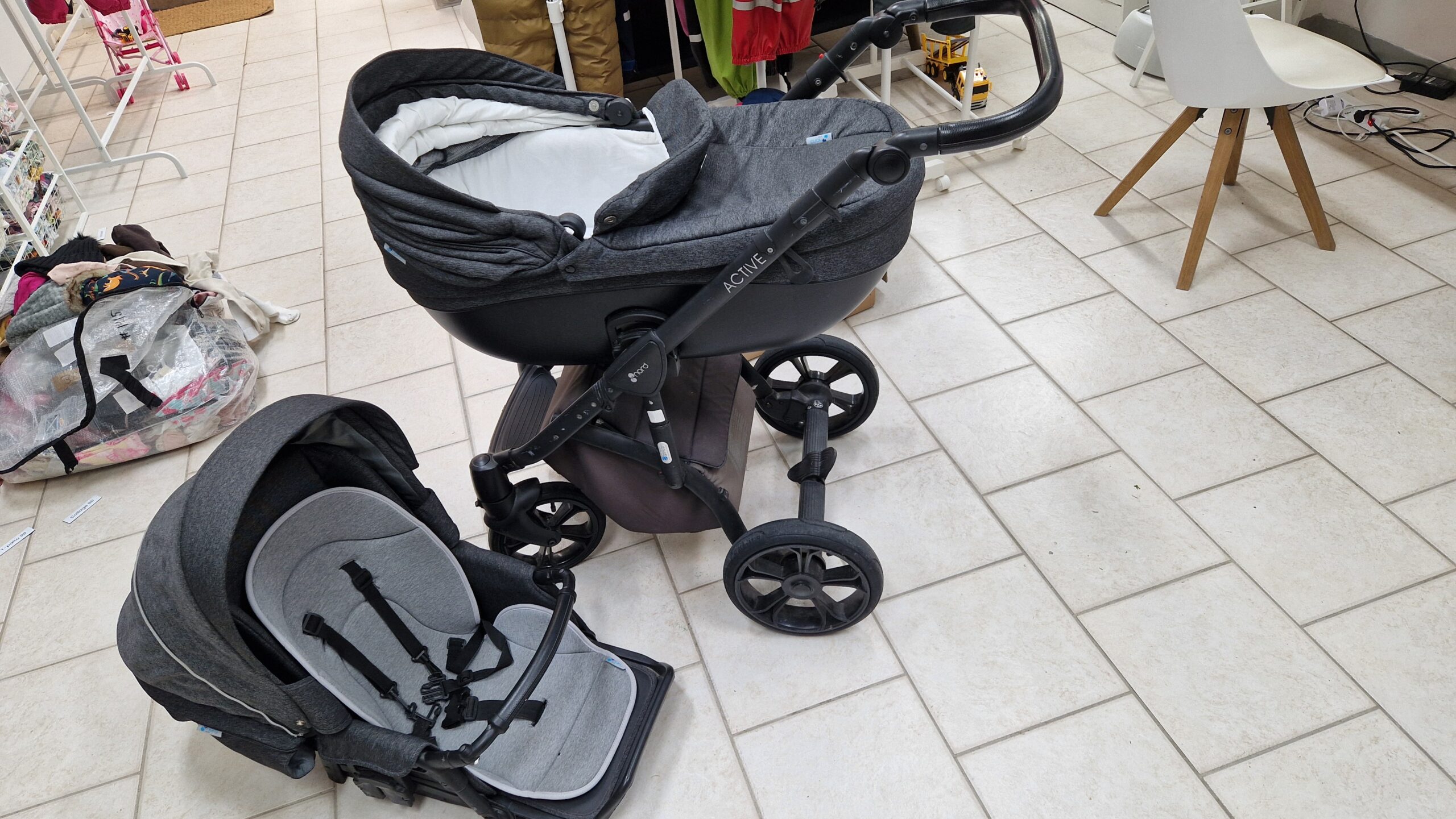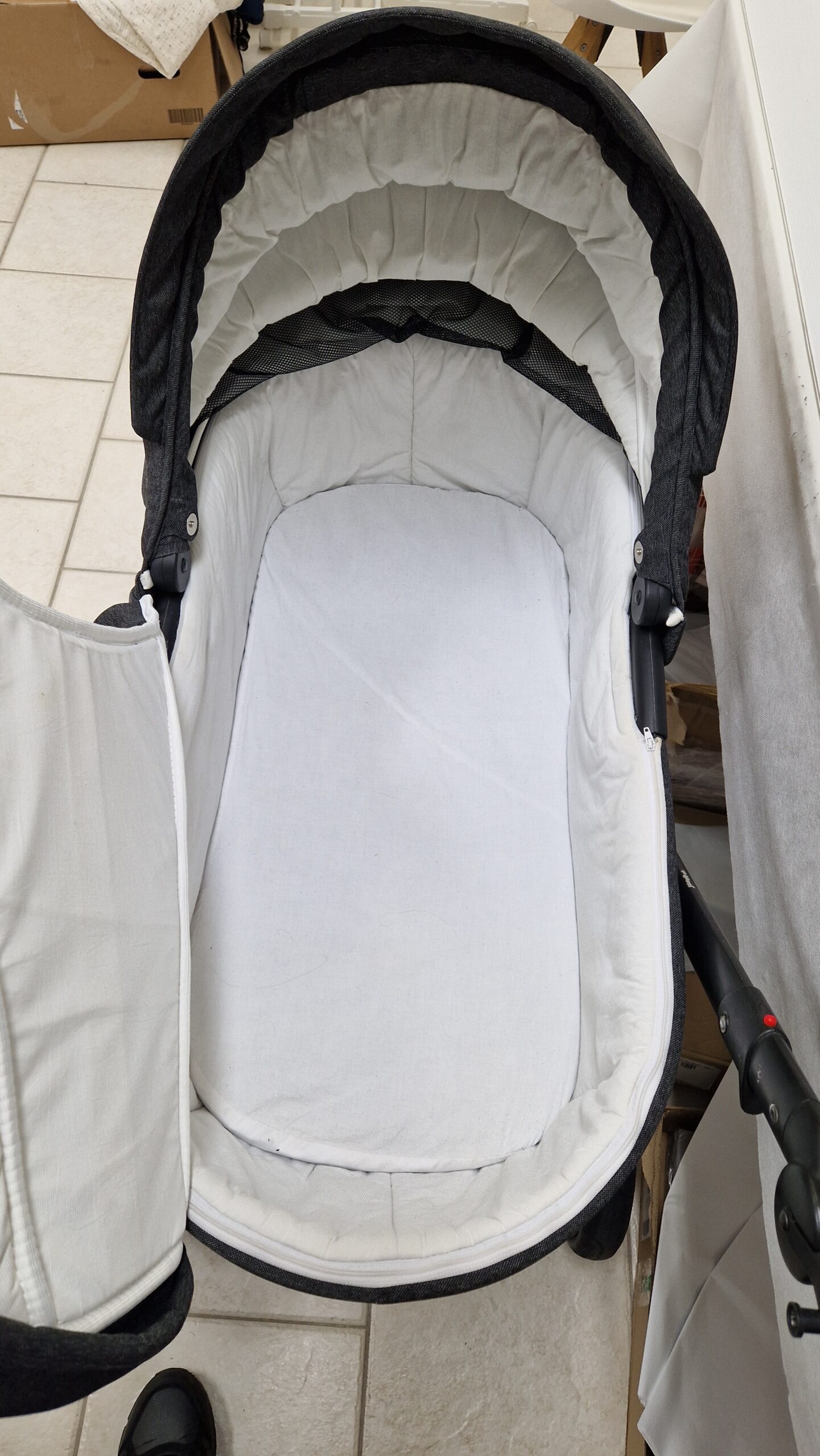 Mukaan istuinkoppa, hoitolaukku, sekä istuin.