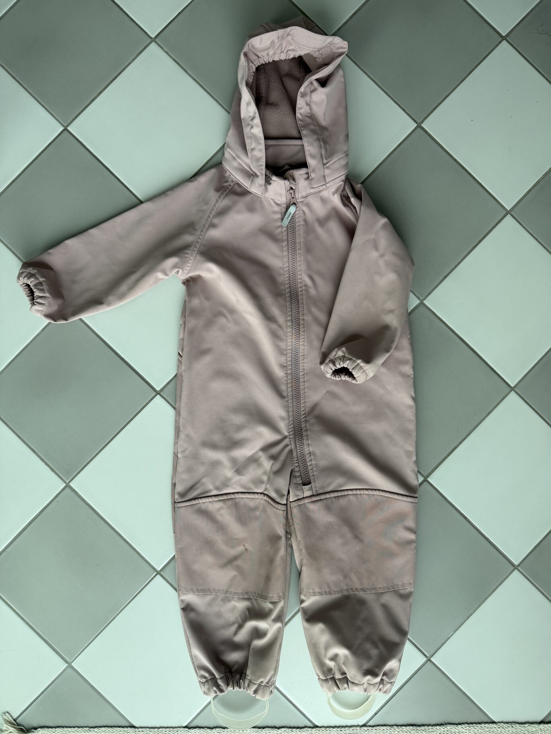 Name It soft shell haalari. Yhdellä lapsella, yhden kauden käytetty. Rinnassa ja polvessa vaaleat tahrat, joita ei uskallettu yrittää poistaa tahranpoistoaineella, jotta haalarin ominaisuudet eivät kärsi.