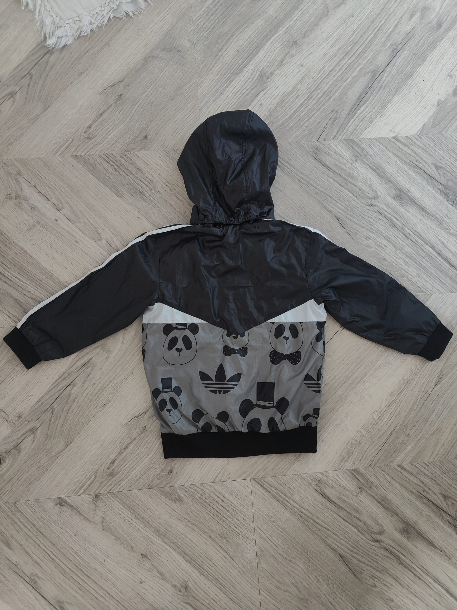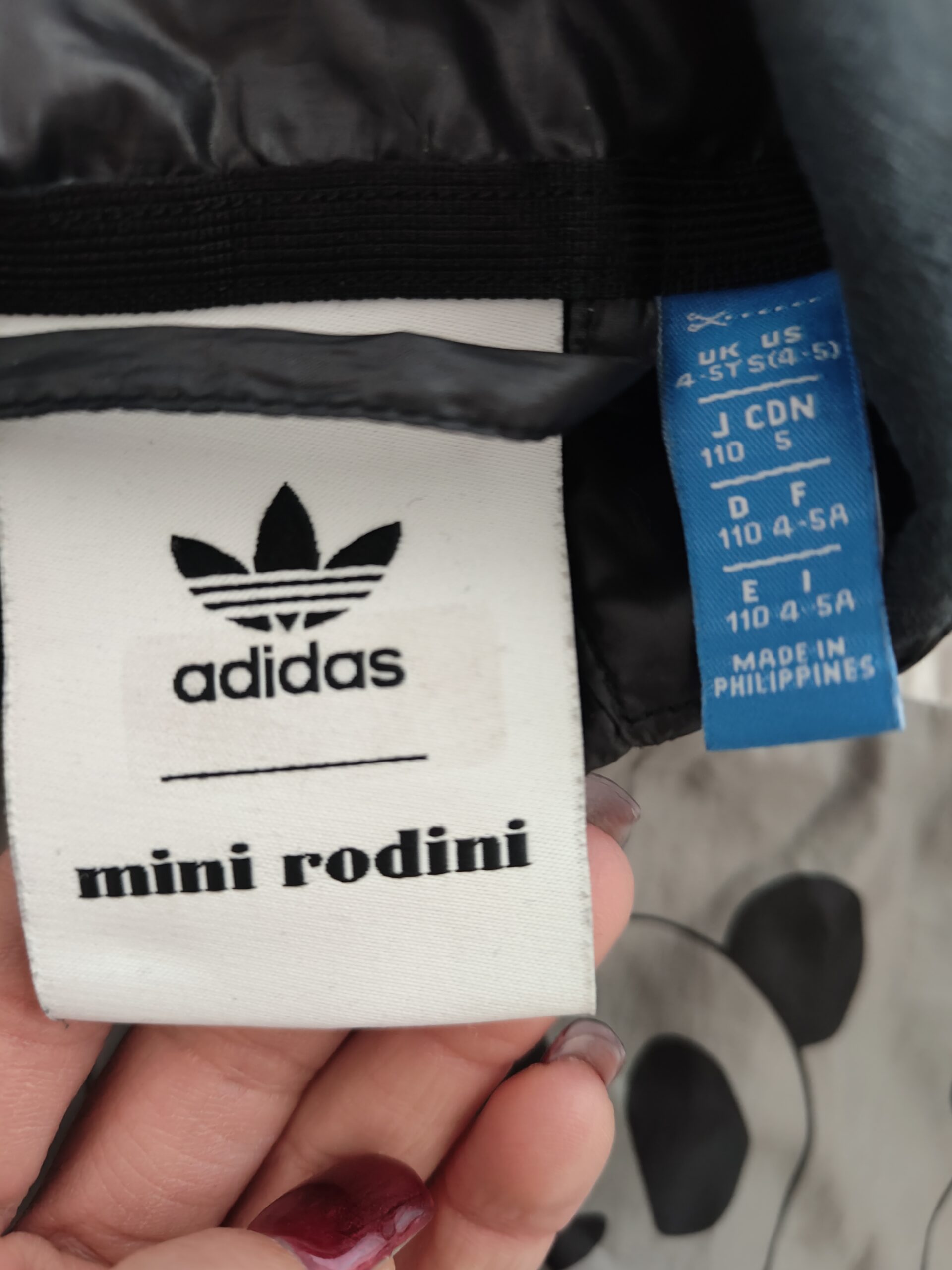 Adidasxminirodini tuulitakki . Koko 110 menee 110/116 koossa , eli enemmän reilu kun nafti . Siistissä kunnossa. Ei reikiä .
